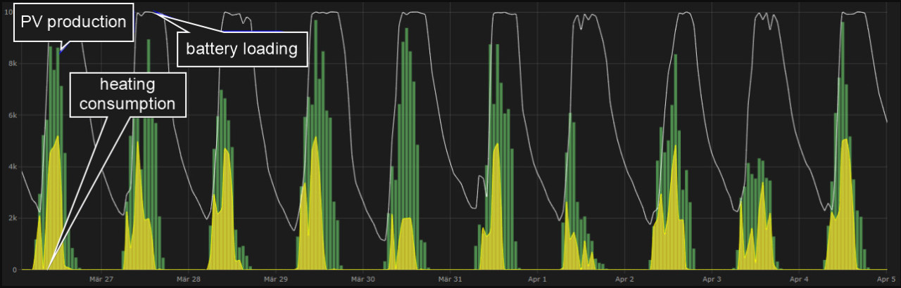 The automation only really works when the sun is shining: on days when sufficient PV electricity is generated (in green), the heating (in yellow) can be started during the day. If the PV forecast is low, the automation allows the set target temperature (22.5 °C in my case) to be reached after 2 a.m., which means that the heating is activated earlier. If the PV forecast is good, the automation waits until the sun is shining. Here is another example of a few days with 100 % self-consumption including battery status: