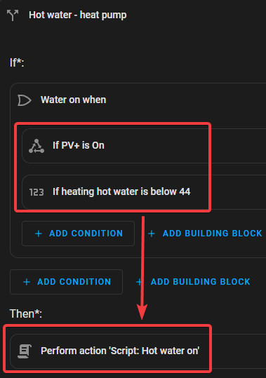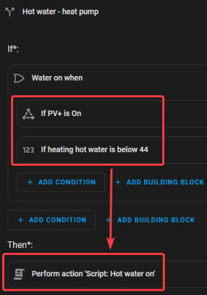 The ESP switches off when the target temperature is reached and prevents the hot water from cooling down completely. The automation only has to determine the start time for hot water preparation. To determine the optimum time, I use the previously created template sensor for the PV surplus (PV+) and use the "Hot water on" script as the action.