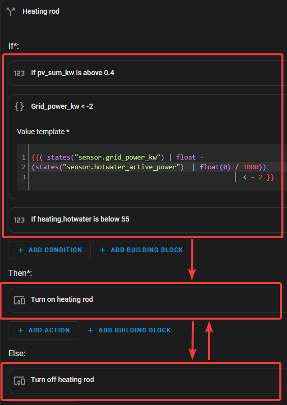 The heating rod becomes active when more than 2kW is fed into the grid: "Grid_power_kw < -2". 2kW. If the heating element is switched on, it reduces the surplus, so use a value template at this point to deduct its consumption.