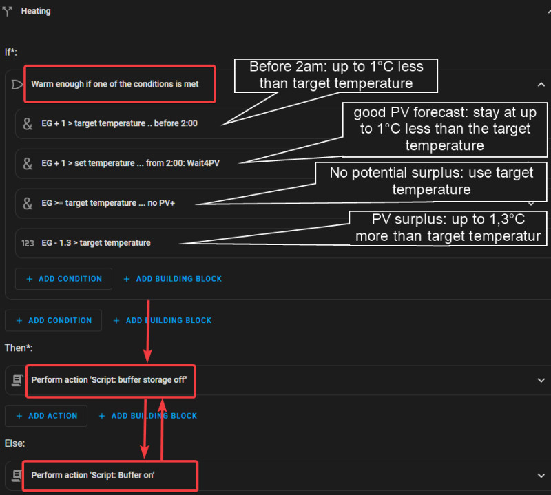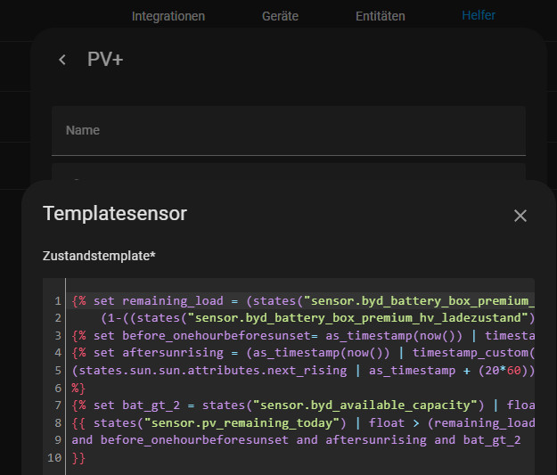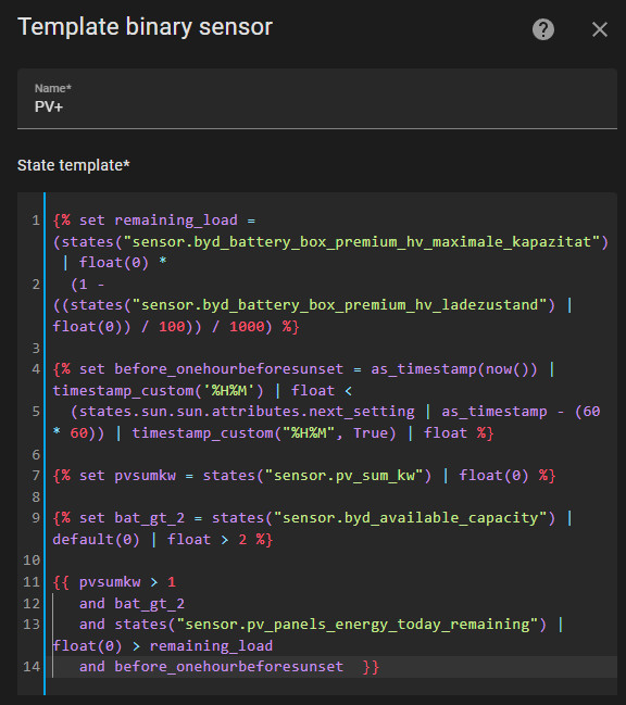 The template sensor switches to on when over 1kW is produced by the PV system (pvsumkw >1), the PV battery level is at least 2 kWh (bat_gt_2) and the PV forecast for the remaining day is greater than the remaining capacity of the battery (states("sensor.pv_remaining_today") | default(0) | float > remaining_load ). Ok, I can see that this sentence is difficult to digest, perhaps an example will help: Assuming the 10 kWh battery is 50% charged, 5 kWh are still missing until it is full. If the PV forecast for the remaining day is greater than 5 kWh, the template triggers: There is a potential surplus and the target temperature of the rooms is raised via the following automation. This means that the heating can be activated even before the battery is 100% charged. And if the PV forecast is correct, the battery will still be fully charged later that day. I originally used the service "Forecast.Solar" and "energy_forecast_today_remaining" for the control, but have since replaced this with a mix of weather forecast and the previous day's yield data: in the template: "sensor.pv_panels_energy_today_remaining". If there is interest in this, I will write a separate article. For more information on automation, see: Home Assistant automation - possibilities & basics.