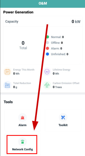 After logging into the app, the network setup follows: click on O&M and "Network Config":