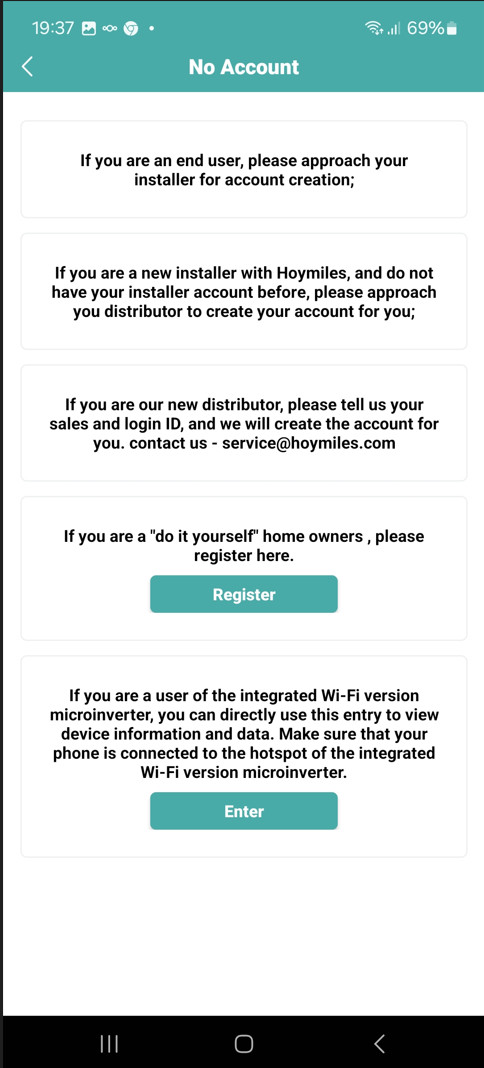 According to the support team, a DIY account can be created from one of the following countries: Germany, France, Poland, Netherlands, Italy, Austria, Spain, Portugal, Switzerland, Belgium, Luxembourg and from the Czech Republic. If the option is not displayed, Hoymiles support will offer to create the account by sending the serial number of the DTU and the inverter by email.