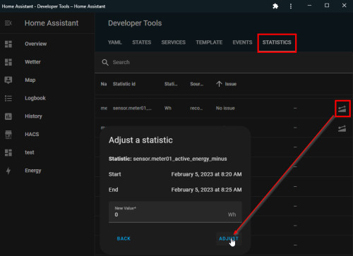 Originally, I had wrong values in the database every now and then when reading out the smart meter. I was able to correct the cause, but the wrong values do not look so good in the statistics. Only after I spent some time correcting the statistic data directly in the database, I discovered that wrong statistic values can be easily edited in Home-Assistant.