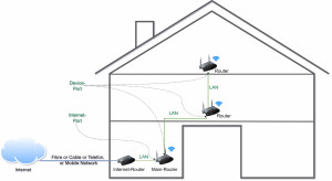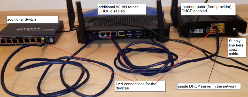 In the following example, an additional Wi-Fi router is added to the Internet router and a switch is connected for additional LAN ports: