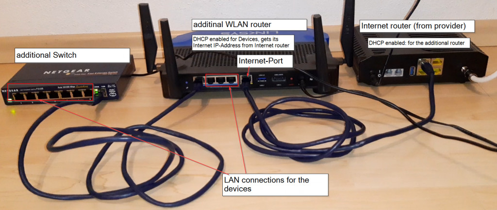 Alternatively, the local network of the Internet router can be extended by an additional local network with an additional router. In this variant, the home network of the Internet router serves only as a connection network for the additional router; accordingly, no devices should be connected to the Internet router or connected via Wi-Fi.