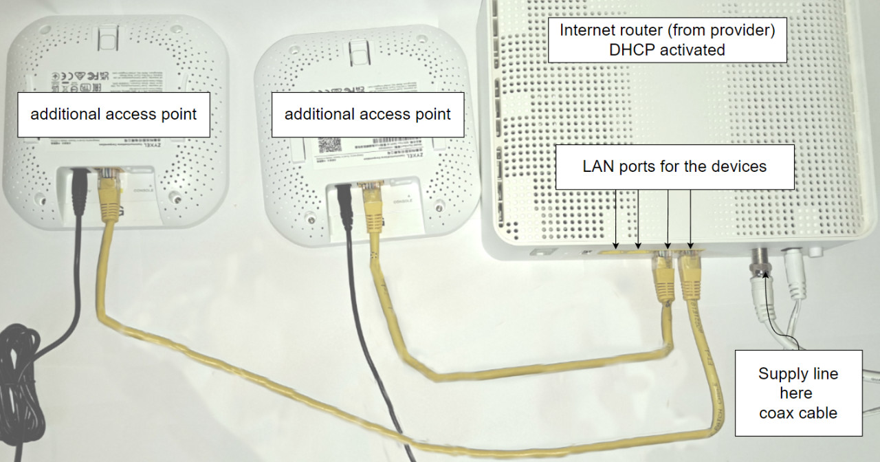 For the settings of the devices, see: Internet router settings and examples Router as an access point.