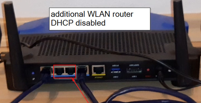 All ports and Wi-Fi accesses in the figure are in the same network: The additional router also behaves like an additional switch, for the end devices it does not matter in which port and on which of the devices they are plugged in, not even to which device the Wi-Fi is currently connected.