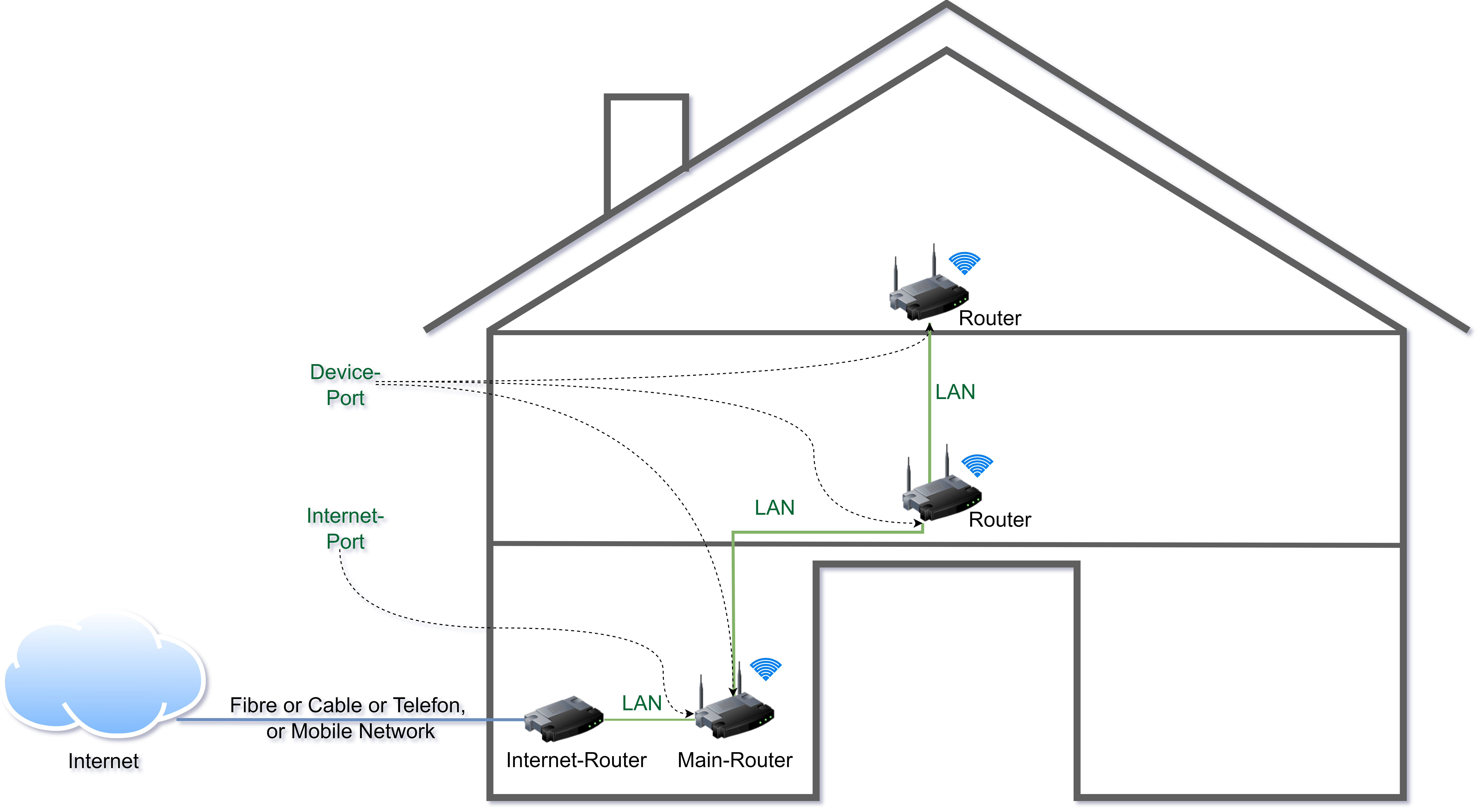 For the settings of the devices, see: Internet router settings, Own router settings and Examples Router as access point.