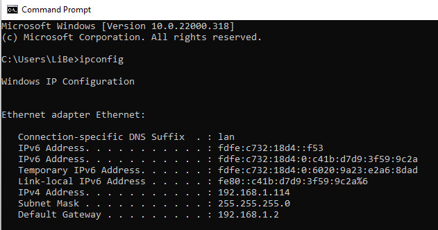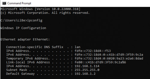 In a 2nd window the ping could also be started on the router (default gateway). With the ping on the default gateway the route within the home network, i.e. up to the router, can be monitored. As a prerequisite for this, the address of the default gateway can be found out with the ipconfig command: