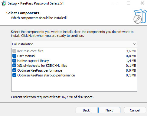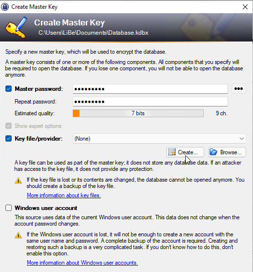 To increase security, I also created a key file. The key file must be available for opening the database file together with the password, so I copied the file to all devices that later need access to the database. If someone should have access to the cloud storage and therefore to the database file, they will additionally need not only the password, but also the key file. The database file alone is worthless.
