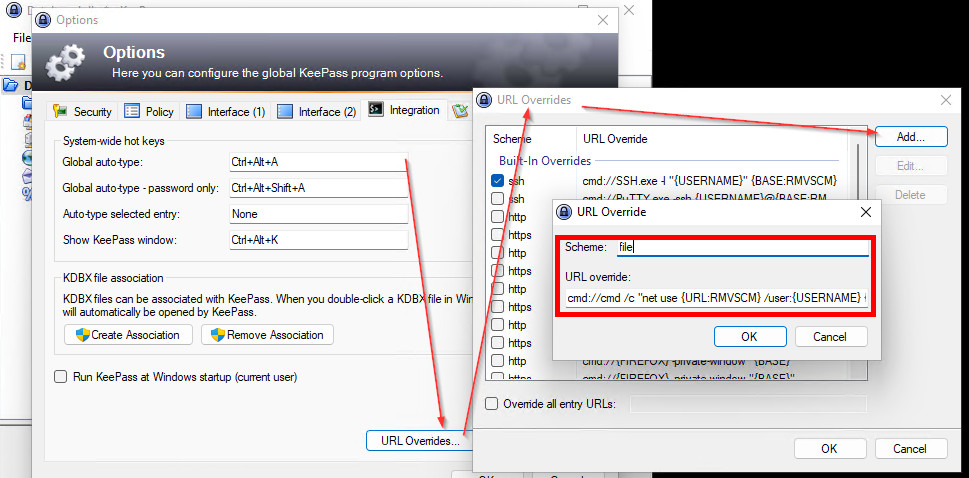 To automatically start RDP sessions from KeePass using “Open URL”, RDP must be entered under URL Overrides.