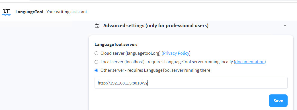 Those who run their own LanguageTool server can store its address in the browser plugin.
