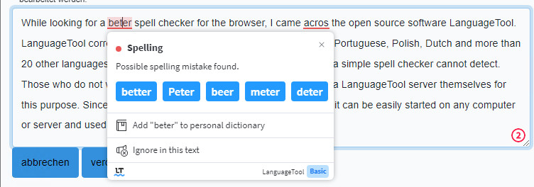 While looking for a better spell checker for the browser, I came across the open source software LanguageTool. LanguageTool corrects errors for English, Spanish, French, German, Portuguese, Polish, Dutch and more than 20 other languages. In doing so, LanguageTool also finds errors that a simple spell checker cannot detect. Those who do not want to send their texts to a cloud service can run a LanguageTool server themselves for this purpose. Since the service is also available as a Docker version, it can be easily started on any computer or server and easily used in your own network.
