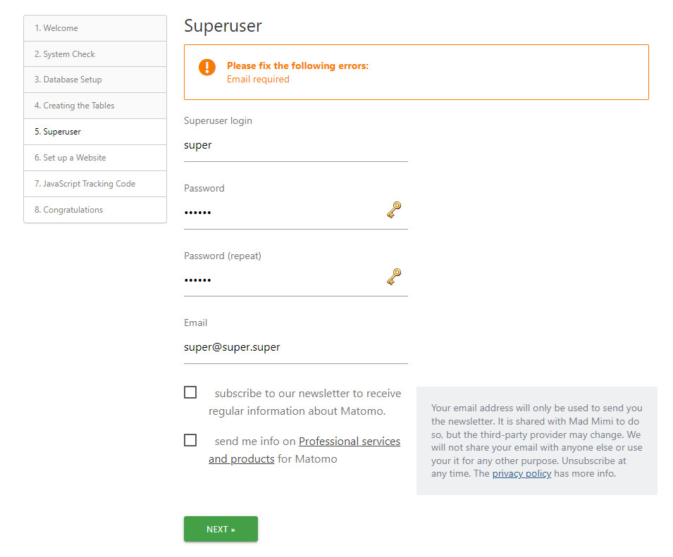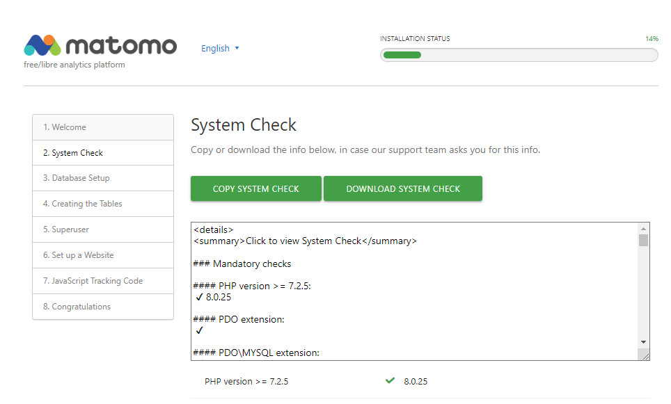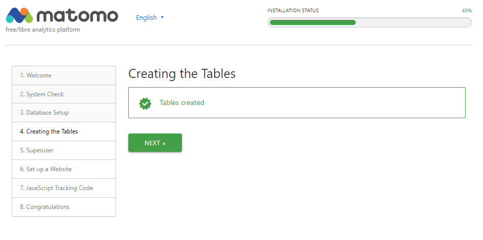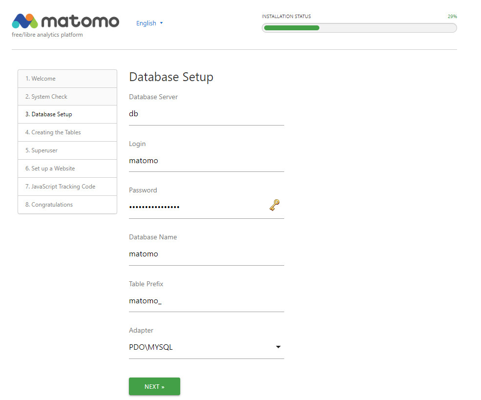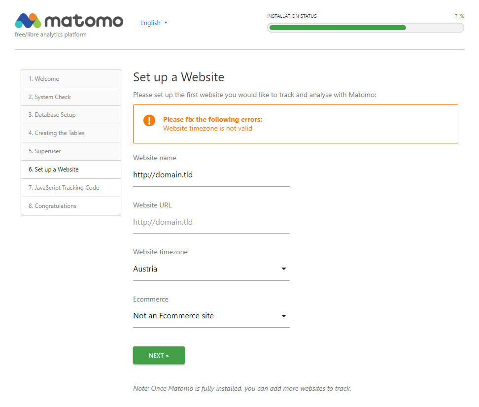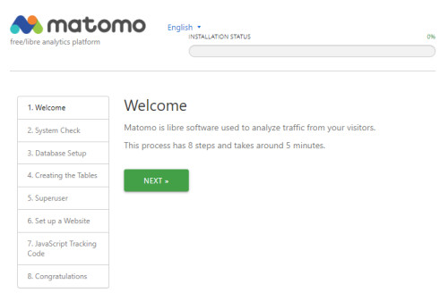 After startup, Matomo should be accessible from the specified domain. The first call leads through the setup wizard: