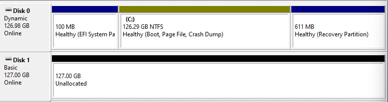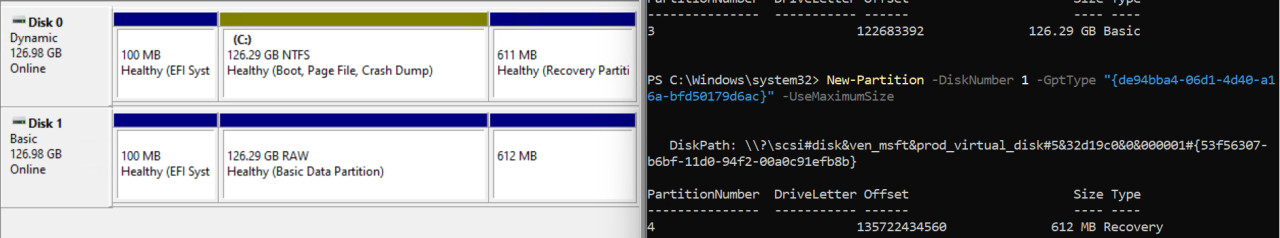 The secondary disk should not yet be converted to dynamic. If the disk is already on dynamic, it can be converted to BASIC. For the creation of the partitions I have compiled the following PowerShell commands: