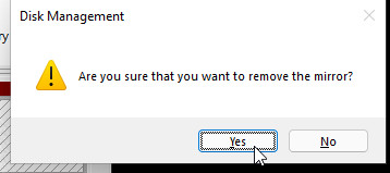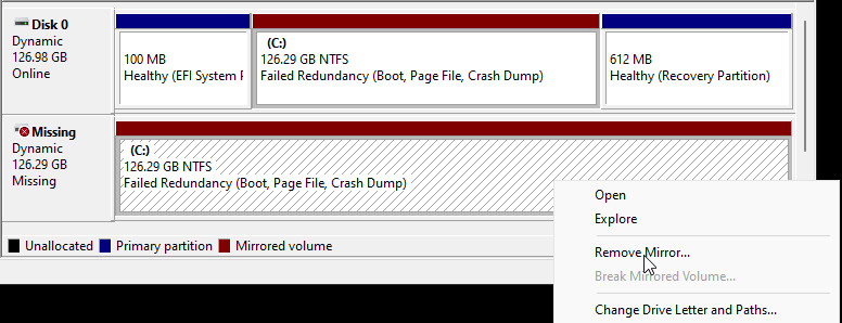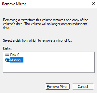 If the disk is permanently unavailable, it can be permanently removed with "Remove Mirror":