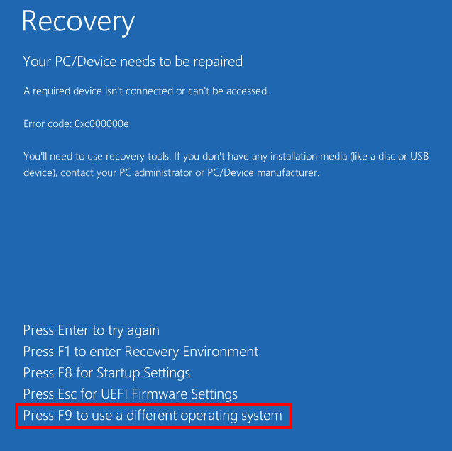 I have tried a few things and tested the procedure described here several times. If you follow all the steps described when creating, you should be able to boot the computer at this point with F9. If the PC still does not boot, the Windows setup media can be used to boot or repair the EFI partition: Windows 10 / 11 - Download Installation - DVD or USB Boot. Using the Windows boot medium, it is even possible to subsequently create an EFI system partition for booting. The EFI partition only has to find space on the first 2.2 TB of the boot hard disk. For the creation of the EFI partition, see : Change Windows 10 BIOS (Legacy) to UEFI Boot.