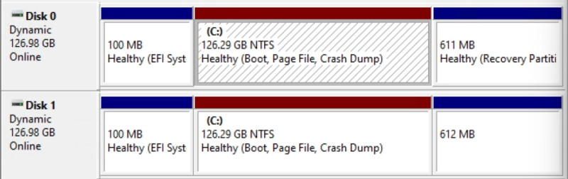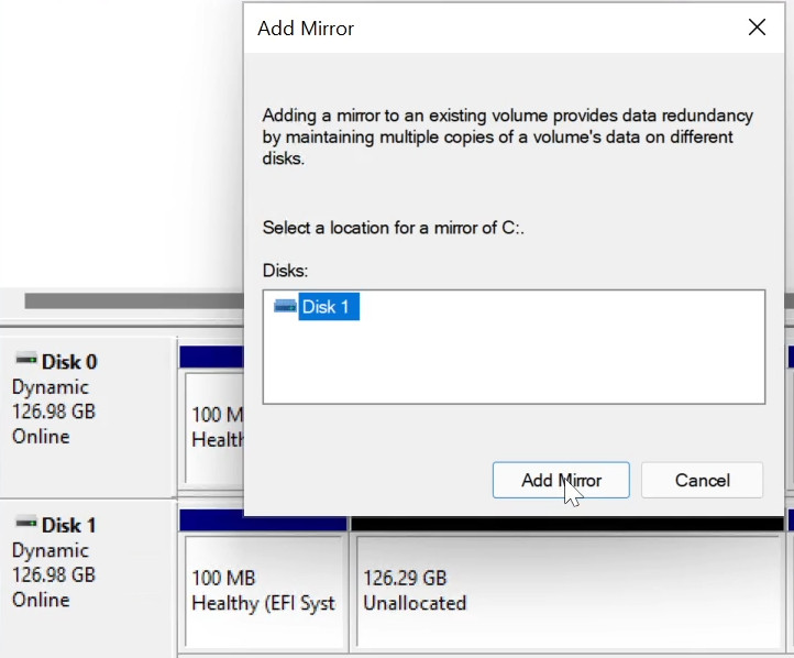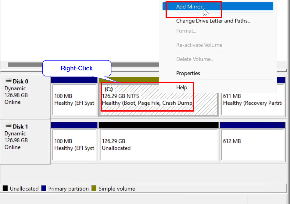 | Add mirror | Right-click on the c-drive of the primary disk |