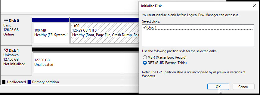 When starting the disk management, it wants to initialize the new disk for our mirror first: