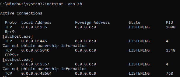 With the parameter /b netstat tries to display the underlying process based on the PID, for this administrator rights are required: