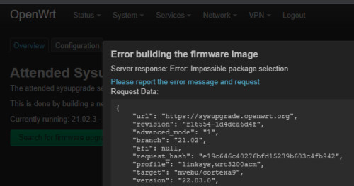 If you install a new version using images from the "Table of Hardware: Firmware downloads" page, you will also lose activated software packages. Even though the software packages can be reactivated via the menu afterwards, this procedure is not really comfortable. To make the upgrade process a bit easier I wrote down the names of all packages and reinstalled them via a command line in the terminal, see: OpenWRT - my setup. When using the firmware selector, a user-defined download with additional software packages can be requested, which means that less storage memory is required and these are available again after the upgrade has been installed: