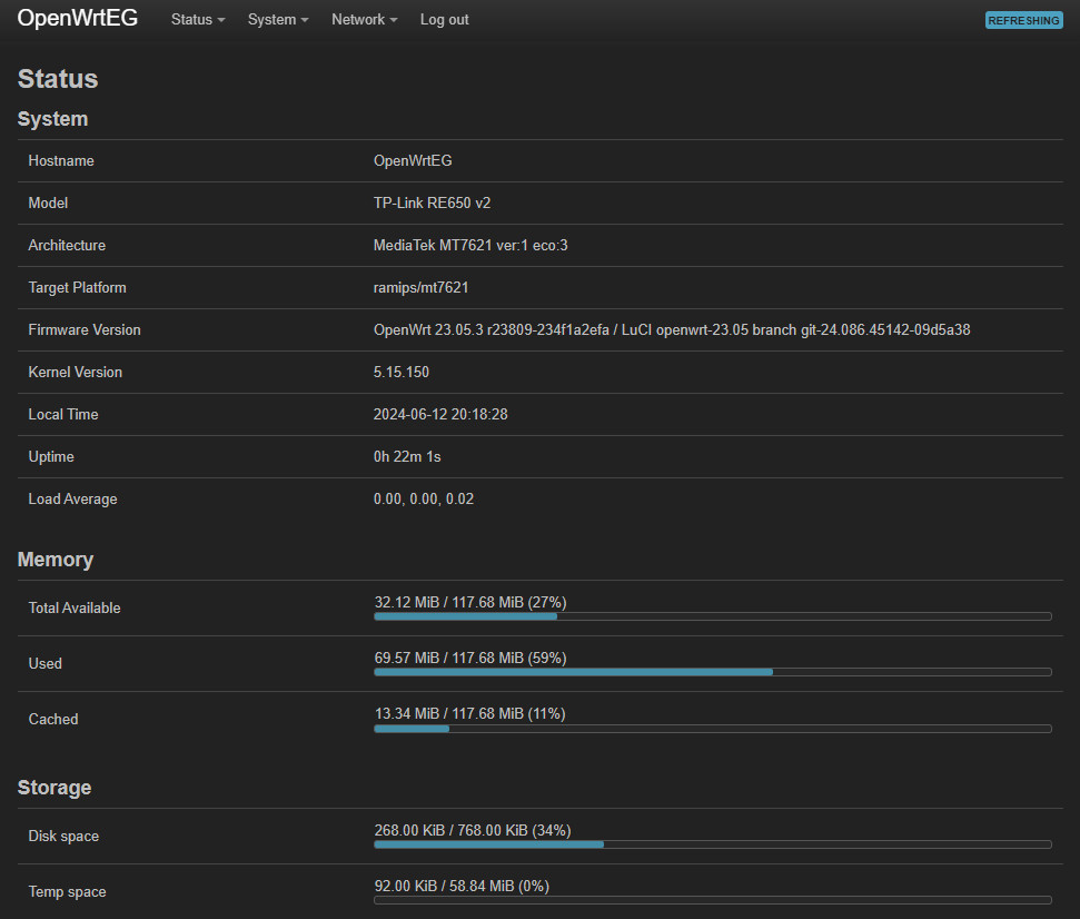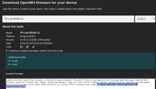 The TP-Link RE650 v2 has only 768KiB disk space, but I was able to add the complete wpad package, usteer and luci-attendedsysupgrade via the Attendedsysupgrade. The storage space required for this is only 268 KiB, although wpad would require 695 KiB if installed via System / Software: