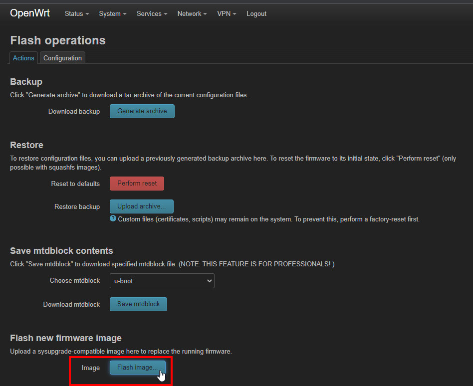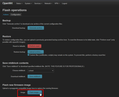 Devices that already use OpenWrt can exchange their firmware for a newer version via the menu "Backup / Flash Firmware" with a sysupgrade image. New versions for the respective devices can be downloaded from the OpenWrt page: Table of Hardware: Firmware downloads.