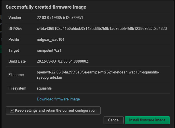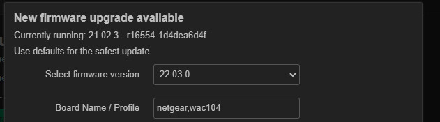 The software package "luci-app-attendedsysupgrade" provides a wizard for upgrading the firmware. Attended Sysupgrade combines the capabilities of the firmware selector and compiles a sysupgrade file based on the installed packages and downloads it independently. The whole process can be initiated comfortably via the wizard directly from the OpenWrt gui. In the background the Attended Sysupgrade takes care of creating, downloading and installing the upgrade with all previously installed packages and with all settings.
