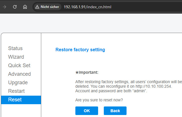 Once the access data has been read out, it should be possible to log in to the web interface again. All inverter settings can be reset via "Reset" and "Restore factory settings":