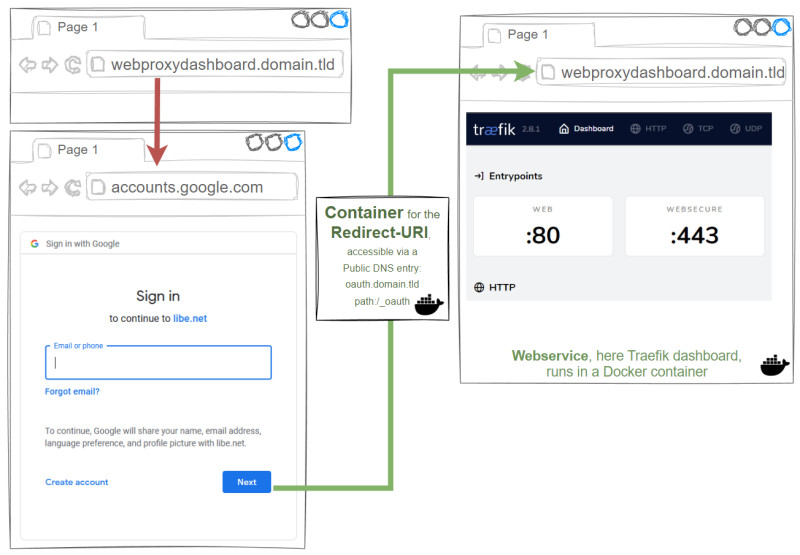 Supplementary to the Traefik Docker setup, for the setup presented here, an additional Docker container (traefik-forward-auth) is used for forwarding the authentication to Google and a public DNS entry for the redirect URL (redirect URI). On the part of Google, the Google Developers portal also requires an oAuth client must be created on the Google Developers portal.