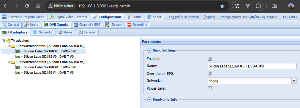 For access in the local network, I use several FireTV sticks and a tablet with Kodi as a client. I currently access the Internet via the Tvheadend web interface. I currently access the Internet via the Tvheadend web interface. Since the web interface is not optimized for mobile devices, I am currently testing TVHadmin-JS and Jellyfin with the TVHeadend plugin at the same time.
