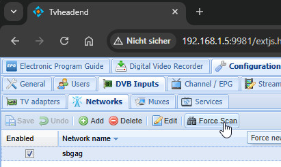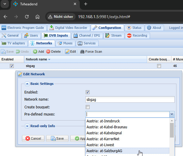 First, I created a network under Configuration / DVB-Inputs / Network:
