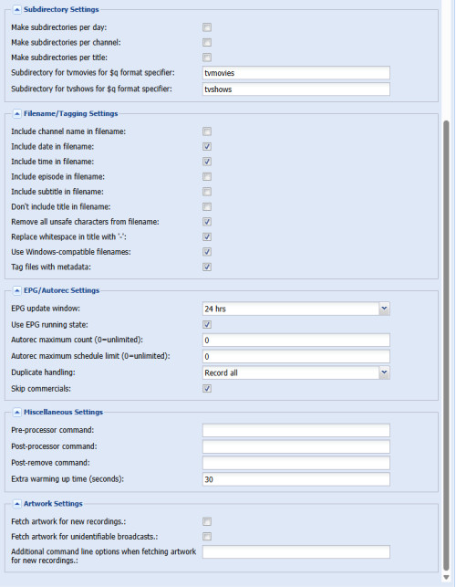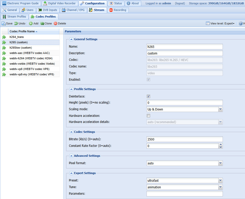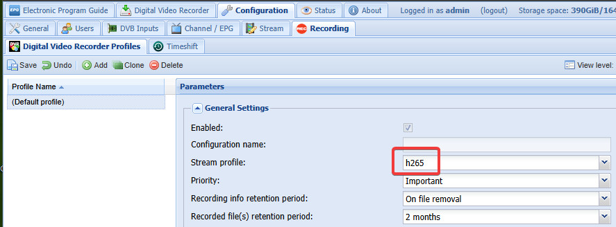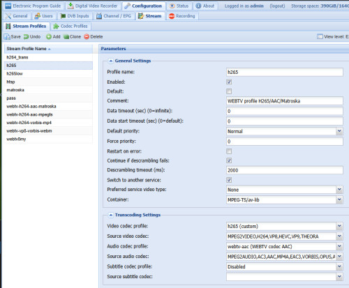 If you are using a reasonably high-performance mini PC, you can transcode the recordings on the fly as H.264 or even better with H.265, which means that they require very little memory and still have very good quality. For HD quality, the stream is reduced from around 10 kB/s to 2.5 kB/s with H.265. As a result, the CPU of my Mini-PC achieves a load of around 25% per stream, which is no problem when using 2 tuners.