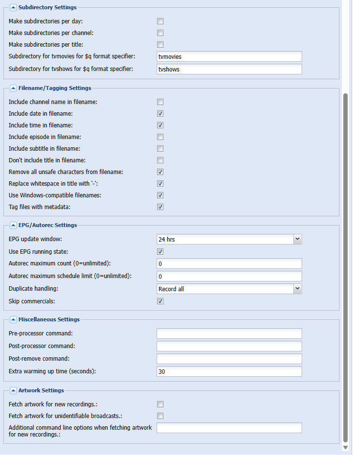 I used "MPEG-TS/av-lib" as the container, as otherwise switching to a different time (skip) would only work with a very long delay. I have deactivated "Hardware acceleration" as I have noticed that the recordings are of better quality as a result. I have not yet got to the bottom of the cause.