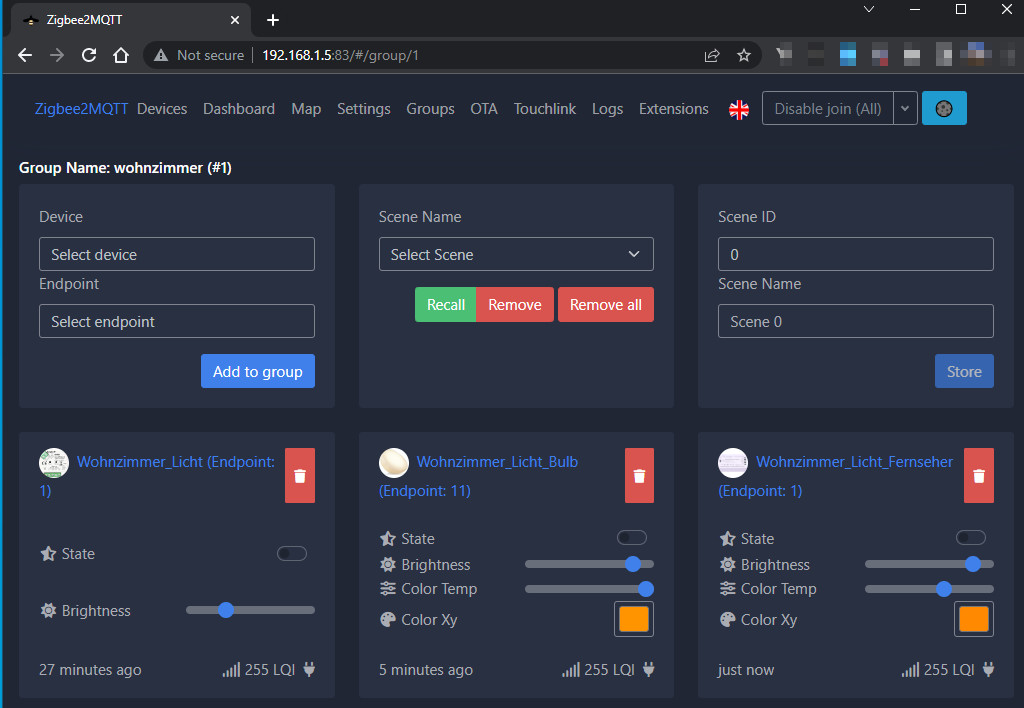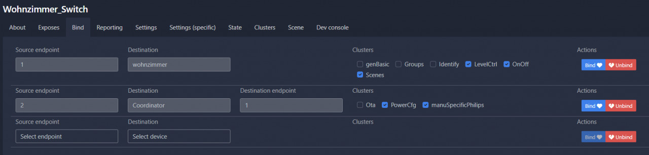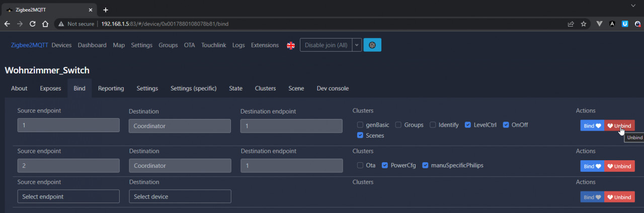 Admittedly, with deConz and Phoscon I did not manage to connect devices like the Philips Dimmer Switch directly to a light. In retrospect, I think the fault was not the cumbersome interface of deConz, but the fact that a switch must be disconnected from the coordinator before connecting to a light: This light has only now dawned on me with Zigbee2MQTT. The Zigbee2MQTT web frontend is clearly much clearer here, and after disconnecting the coordinator I was able to connect previously created groups consisting of several lights to a switch quite easily. The switching process works after the binding even if the Zigbee gateway is completely switched off and contributes significantly to the stability besides a fast reaction.