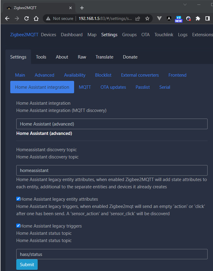 At the first start the teach-in is active for all devices, accordingly they register automatically after a reset or when activating the connection mode. When using the MQTT - Broker and Home-Assistant, the devices are also automatically created in Home-Assistant with the following setting: "Home Assistant integration".