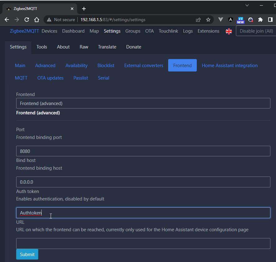 So that not everyone in the WLAN can access the management of Zigbee2MQTT, an authentication token should be set in the settings.