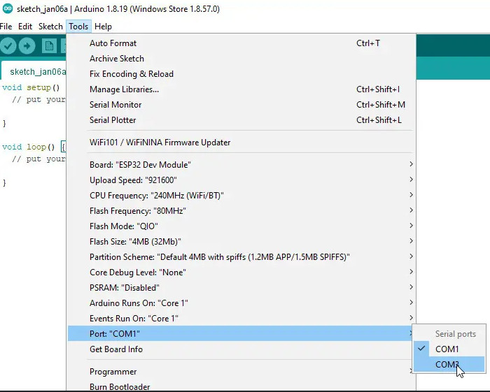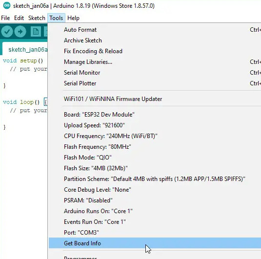 Nach dem Auswählen von COM3 haben wir eine Verbindung zu unserem ESP32: