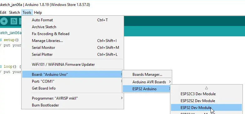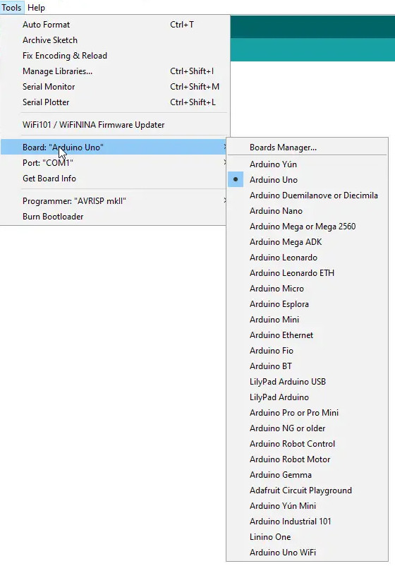 Nach dem Start der IDE kann die Board-Hardware unter Tools, Boards ausgewählt werden.