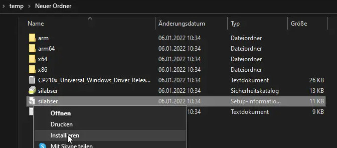 Nach dem Download und dem Entpacken des Treibers kann dieser einfach durch einen "Rechtsklick" und "Installieren" eingebunden werden: