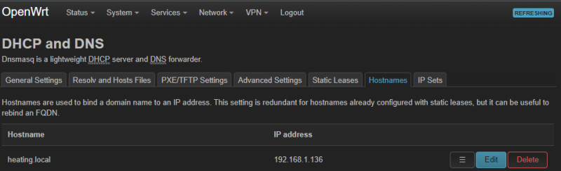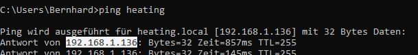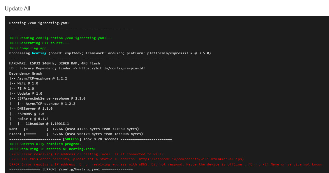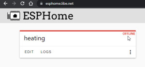 Der ESPHome Docker-Container versucht den Controller offensichtlich mit dessen Namen heating.local aufzurufen. Damit er das kann, habe ich den DNS-Namen des ESP32 am Router hinterlegt und die IP-Adresse meines Routers in der docker-compose.yml-Datei hinzugefügt (dns:...).