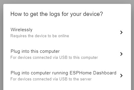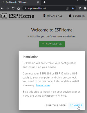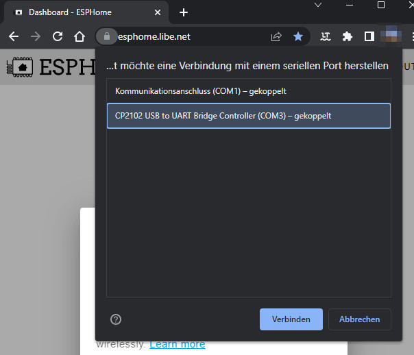 Die Verbindung zum Mikrocontroller muss dabei initial über ein Kabel erfolgen. In meinem Fall habe ich den Mikrocontroller an einem Rechner mit USB angeschlossen, was mir das Verbinden über den Browser mittels des UART Bridge Controller ermöglicht (Plug into this computer). Da die Verbindung zum Mikrocontroller über den Browser erfolgt, spielt es bei dieser Variante auch keine Rolle, wenn der ESPHome-Server auf einem anderen Gerät läuft: