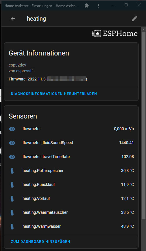 Speziellen Projekten oder der Einsatz einer günstigen DIY-Hardware steht mit ESPHome nichts im Weg. Die zahlreichen Beispiele auf der ESPHome-Seite erleichtern die Programmierung und Einbindung in Home Assistant. Für die Anbindung eines Ultraschall-Durchflussmessers habe ich ein Beispiel auf folgender Seite abgelegt: ESP32 Flowmeter - RS485 Modbus. Wie DS18B20-Temperatursensoren ausgelesen werden können, ist auf dieser Seite zu finden: DS18B20 - Temperatur-Sensoren in ESP-Home. Die Steuerung meiner Heizung habe ich hier dokumentiert: Heizung mit Home Assistant steuern.