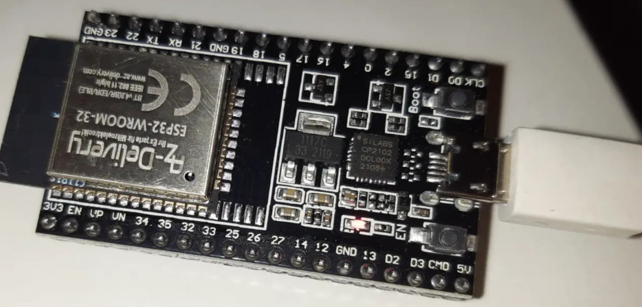 (Bild eines ESP32-Mikrocontrollers an einem USB-Ladekabel)