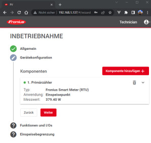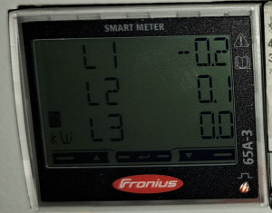 Zwischen dem Zähler und den FI's für die Hausverkabelung habe ich einen Fronius 65A-3 Smartmeter geklemmt und per LAN-Kabel mit dem Wechselrichter verbunden. Etwas überlegt habe ich dabei, von wo ich den Neutralleiter verbinden soll: Die Dokumentation ist hier meiner Meinung nach nicht ganz klar. Nach dem FI, könnte der Smartmeter einen kleinen Fehlerstrom verursachen und vor dem FI wäre der Neutralleiter ungeschützt? Aus den genannten Gründen habe ich den Smartmeter zunächst ohne N-Leiter versucht und siehe da: funktioniert auch.