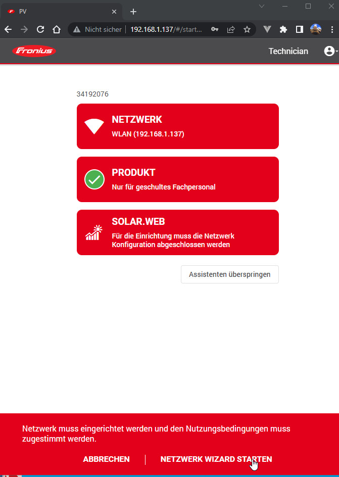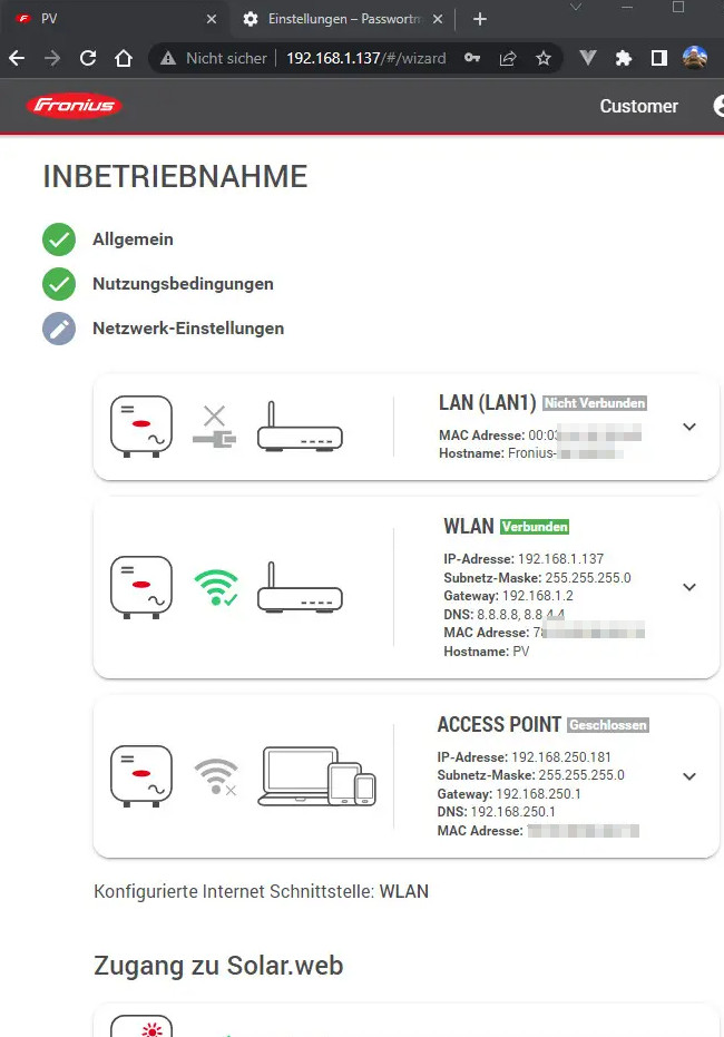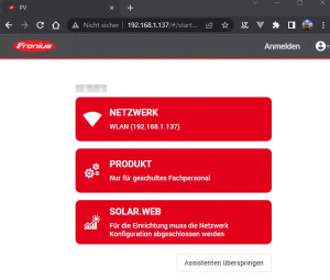Ab diesem Zeitpunkt kann die IP-Adresse des Wechselrichter in der Übersicht des Routers, oder alternativ über einen Power-Shell-Befehl gefunden werden. Je nach Router ist der Wechselrichter ev. Auch mit dessen Hostnamen erreichbar, welchen ich mit "PV" festgelegt habe, also: http://pv