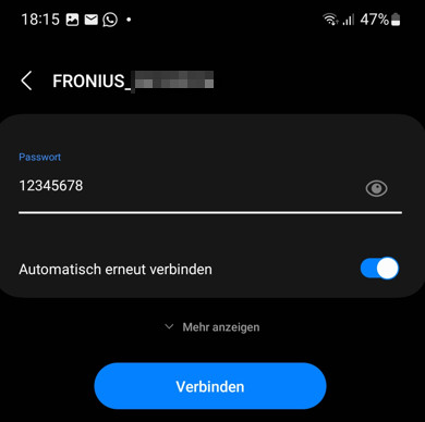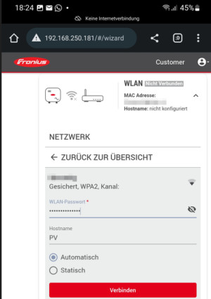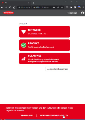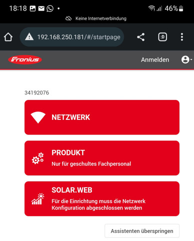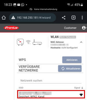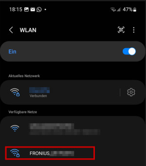 Der WLAN-Hotspot des Wechselrichter besitzt eine Kennung in Form: FRONIUS_???. Nach einem längeren Drücken auf die Taste am Wechselrichter, sollte sich dieser via WLAN als verfügbares Netzwerk melden: