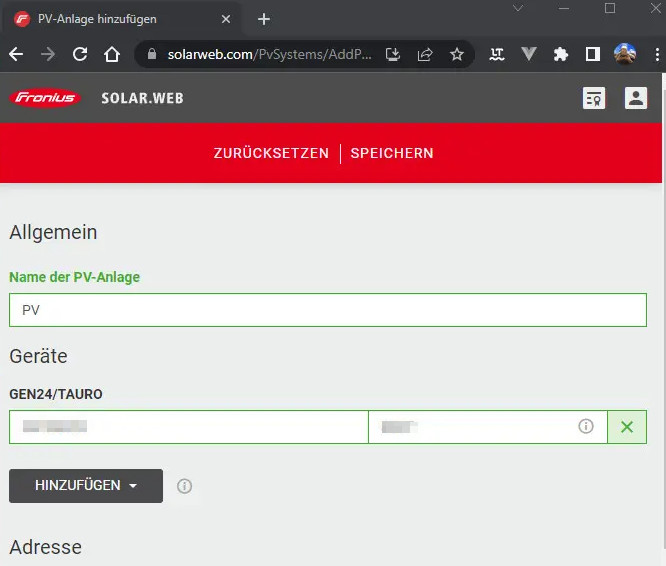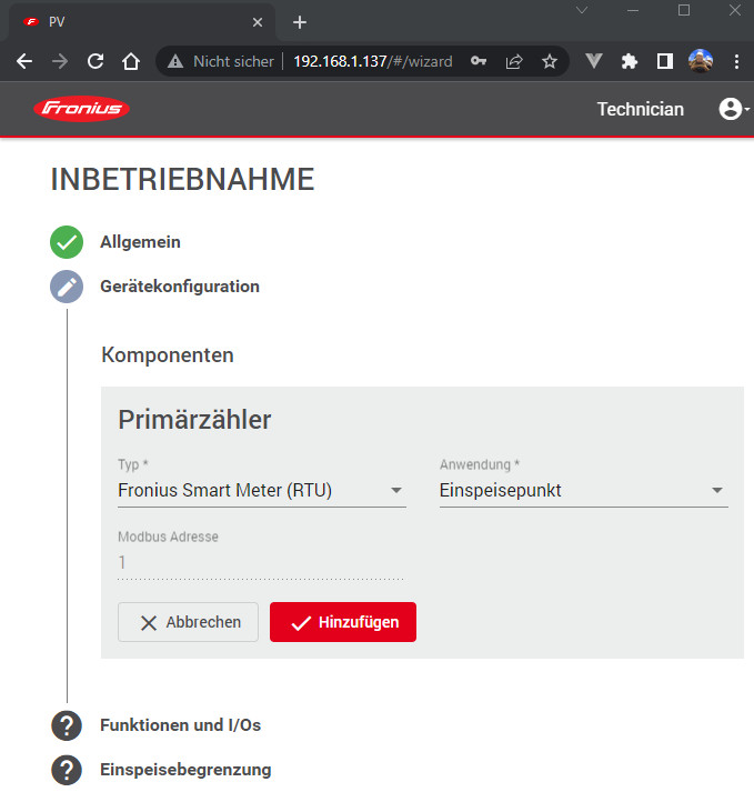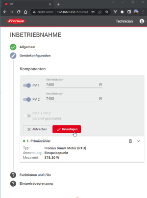 Unter Gerätekonfiguration können dann der Smartmeter, die PV Panels und falls vorhanden, ein Speicher hinzugefügt werden.