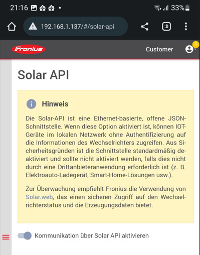 Damit ich Home-Assistant mit dem Wechselrichter verbinden kann, habe ich als Erstes die Solar-API aktiviert: