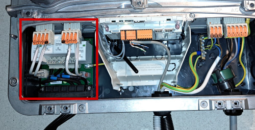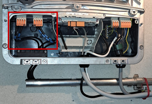 Nachdem ich den Wechselrichter an die Wand gehängt habe, konnte ich die AC-Seite verbinden, inkl. Smartmeter und Notstromsteckdose: